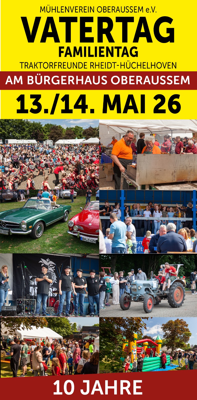 Nach der Pandemie 20/21 veranstaltet der Mühlenverein Oberaußem zusammen mit den Traktorfreunden Rheidt-Hüchelhoven das Vatertagsfest mit TRAKTORTREFFEN. Das Fest wird aus bekannten Gründen in diesem Jahr nicht an der Mühle sondern am Sportplatz in Oberaußem stattfinden.